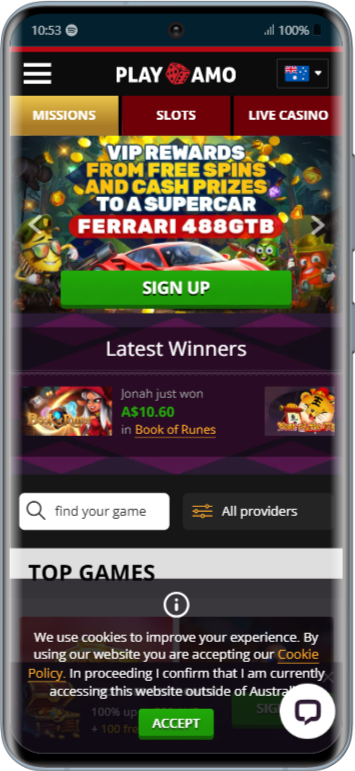 PlayAmo is engineered for mobile mastery. No native app means no storage hogging – just bookmark playamo.com and play via browser. The responsive design scales perfectly: iOS/Android with Full HD graphics and touch-optimized controls, all 3,500+ games, cashier (deposit 10 AUD on the go), live chat, bonuses. Performance with no lags, battery-friendly, supports portrait/landscape. Push notifications for FS drops and tournament alerts. Whether on the train, at the beach, or in bed – PlayAmo keeps the action flowing seamlessly.